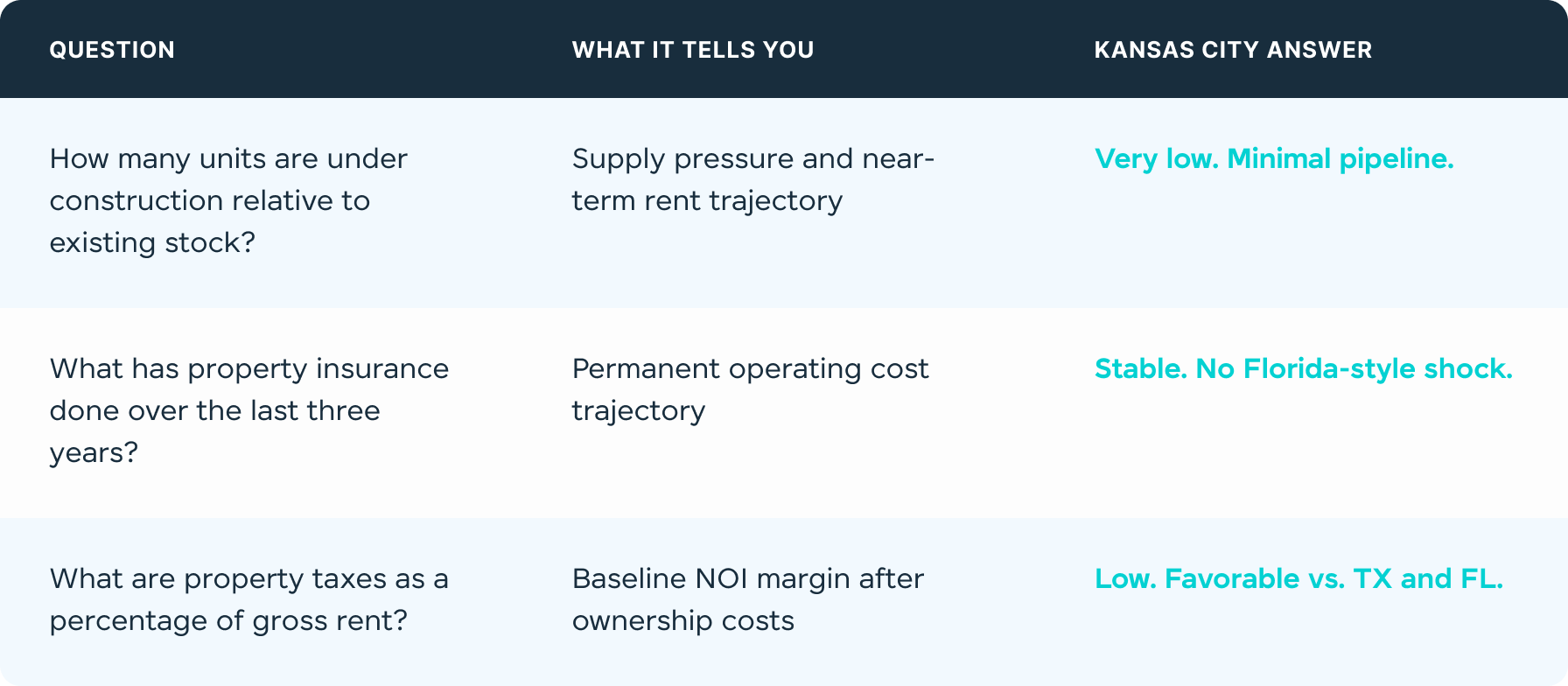 Hard costs for luxury multifamily in Kansas City are running $175–$250 per square foot. OurGMP contract on The Reserve at Copper Creek came in at $176. Across most coastal gatewaymarkets, the same product costs $300, $350, $380 or more per square foot. In many cases,those markets are delivering lower rents per square foot than Kansas City right now, due toelevated vacancy and concession pressure.
