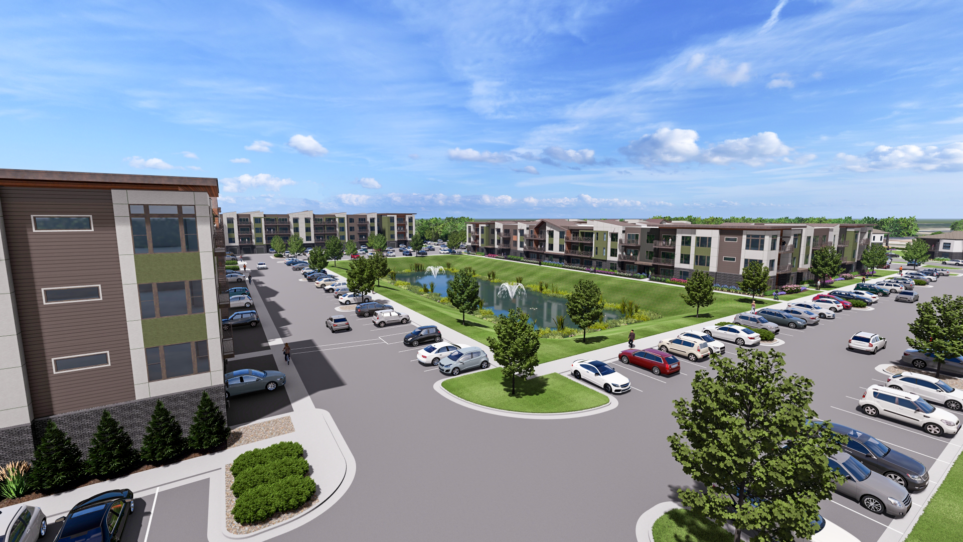 Floorplans include studios, one bedroom, and two bedroom units. Residents will have access to a clubhouse, resort style pool with swim-up bar, fitness center, walking paths, green space, and a dog park. The architectural style is warm and modern, using durable materials and landscaping inspired by the natural character of west Lenexa with a luxury twist. The community is positioned to serve young professionals, families, and long term renters seeking a calm, high quality place to live.